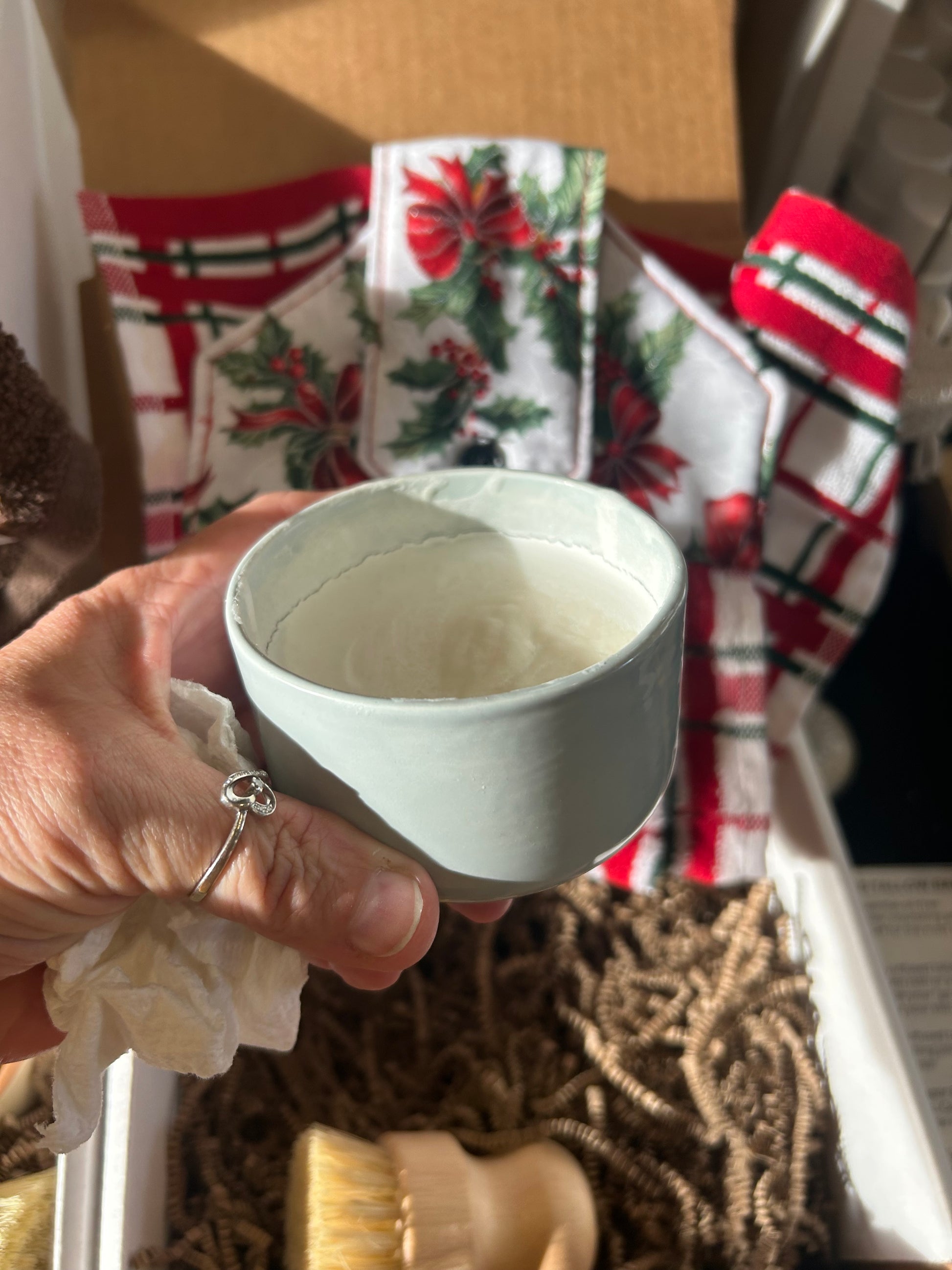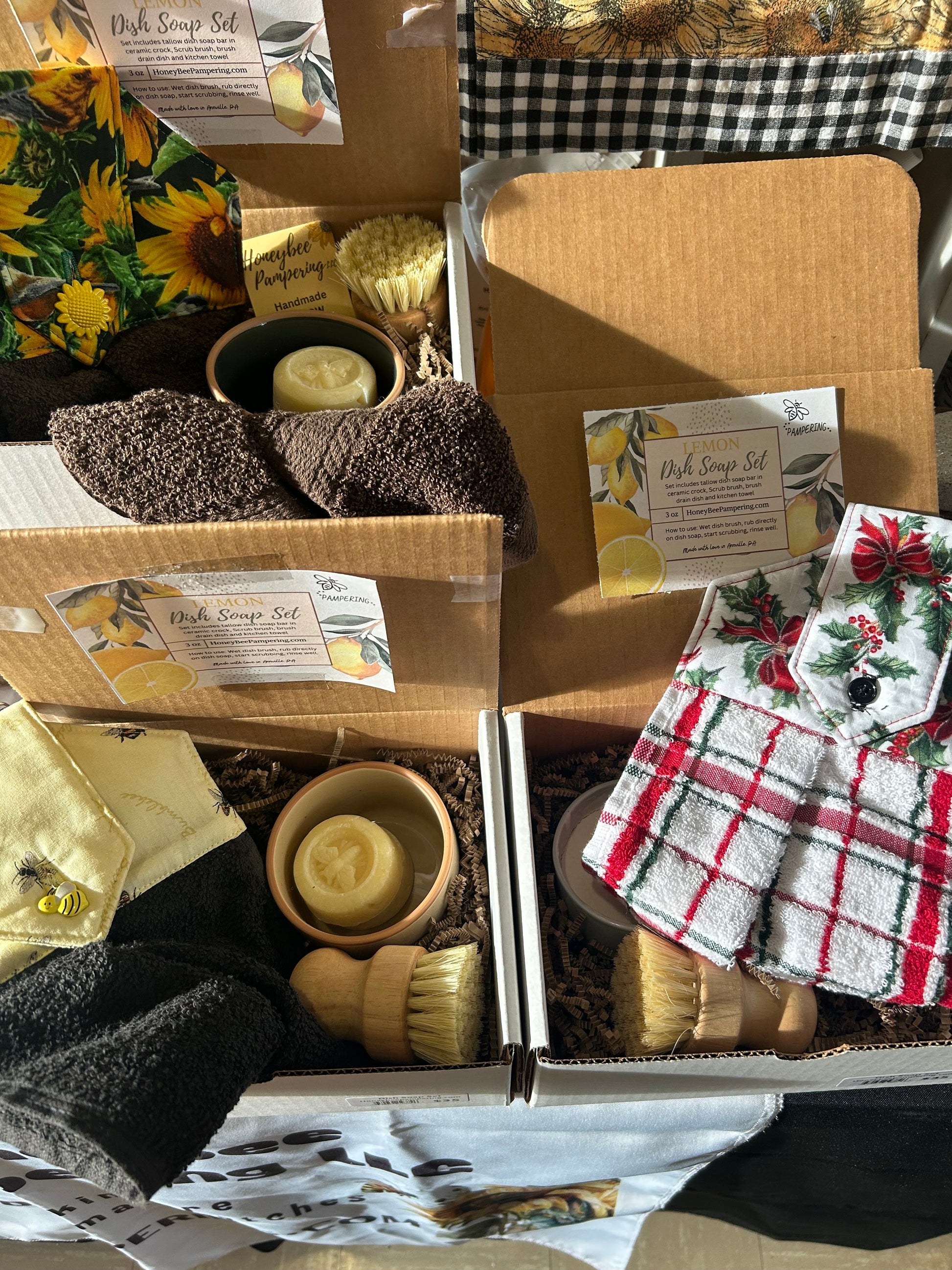 Set includes lemon scented dish soap bar in ceramic crock, Scrub brush and hand-sewn dish towel.